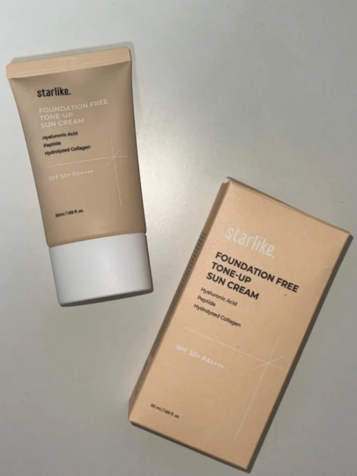 Starlike Foundation-Free Tone Up Sun Cream is an advanced sunscreen with the benefits of tone-up care. Its lightweight texture glides on smoothly, leaving no white cast and delivering a natural glow. Enriched with peptides, collagen, and hyaluronic acid, it deeply hydrates the skin, improves firmness, and maintains elasticity throughout the day. Perfect for daily use under the sun and in an active urban lifestyle.