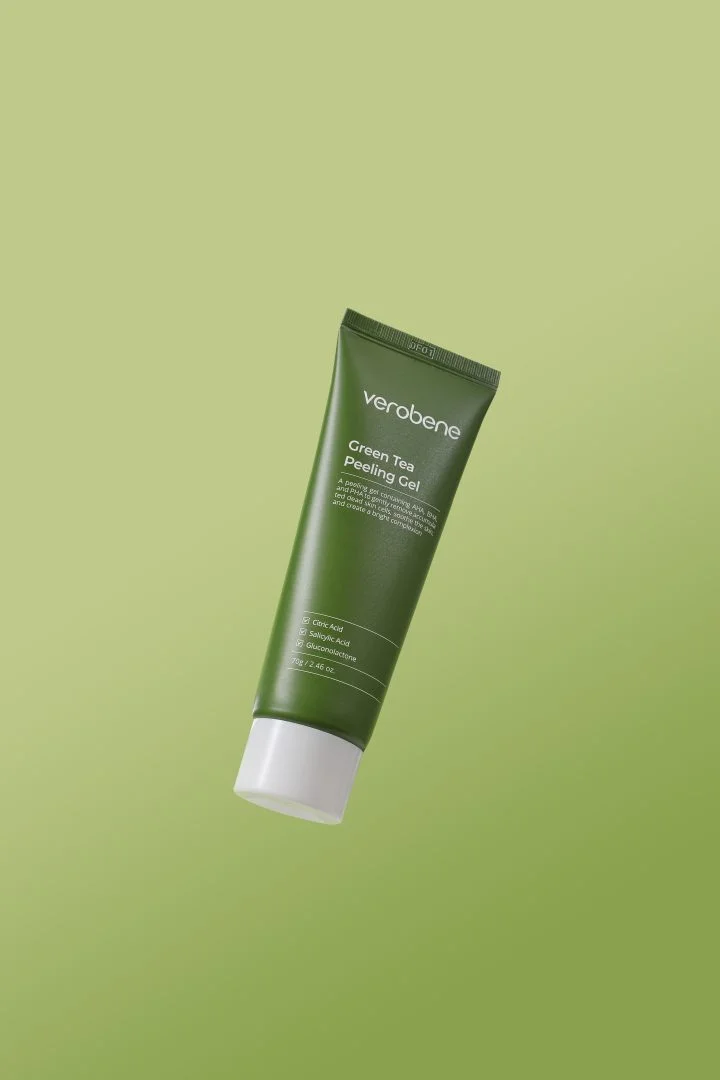 Verobene Green Tea Peeling Gel — a gentle exfoliating gel for smooth and refreshed skin. A blend of AHA (citric acid), BHA (salicylic acid), and PHA (gluconolactone) lifts away dead skin cells, unclogs pores, and improves clarity, while soft cellulose fibers refine skin texture. Botanical extracts (green tea, centella, chamomile, rosemary, ginger, and more) calm irritation and protect the skin. Sodium hyaluronate, panthenol, and allantoin deeply hydrate and strengthen the barrier. Suitable even for sensitive skin, leaving the complexion clear, even, and shine-free.