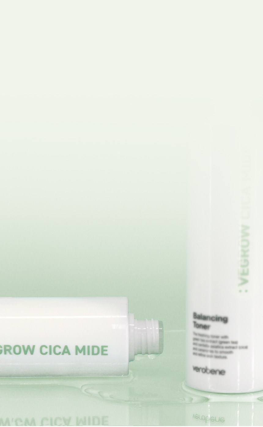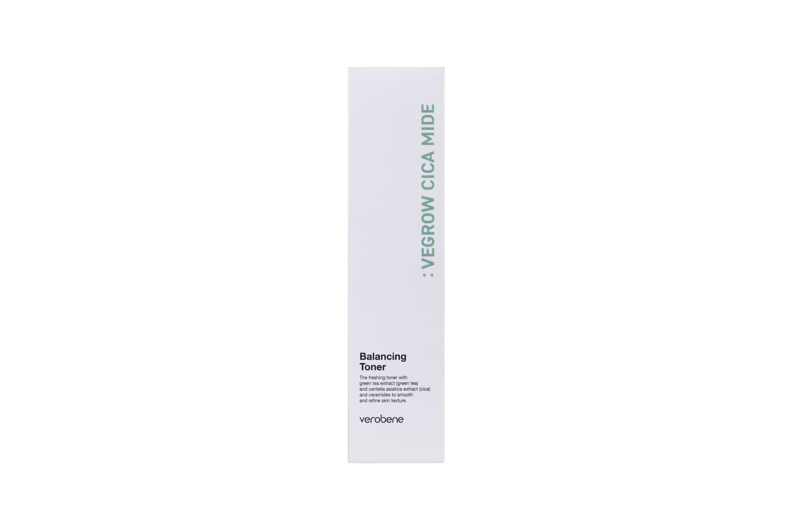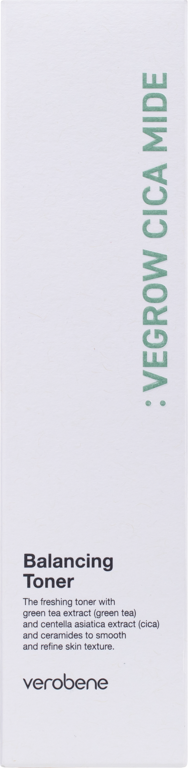Verobene Vegrow Cica Mide Balancing Toner — a vegan balancing toner designed to gently resurface and refresh the skin while maintaining a healthy barrier. AHA/PHA/LHA acids delicately exfoliate, Centella Asiatica and Green Tea calm and revitalize, while Ceramide NP reinforces the barrier and locks in hydration. The water-light, non-sticky texture absorbs quickly, leaving skin balanced, fresh, and comfortable. Perfect for normal, combination, oily, and sensitive skin