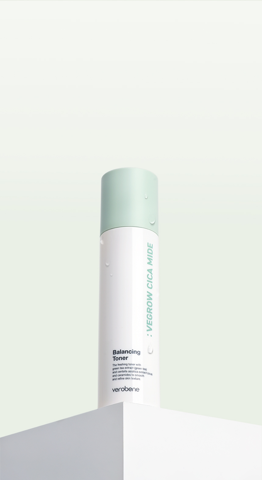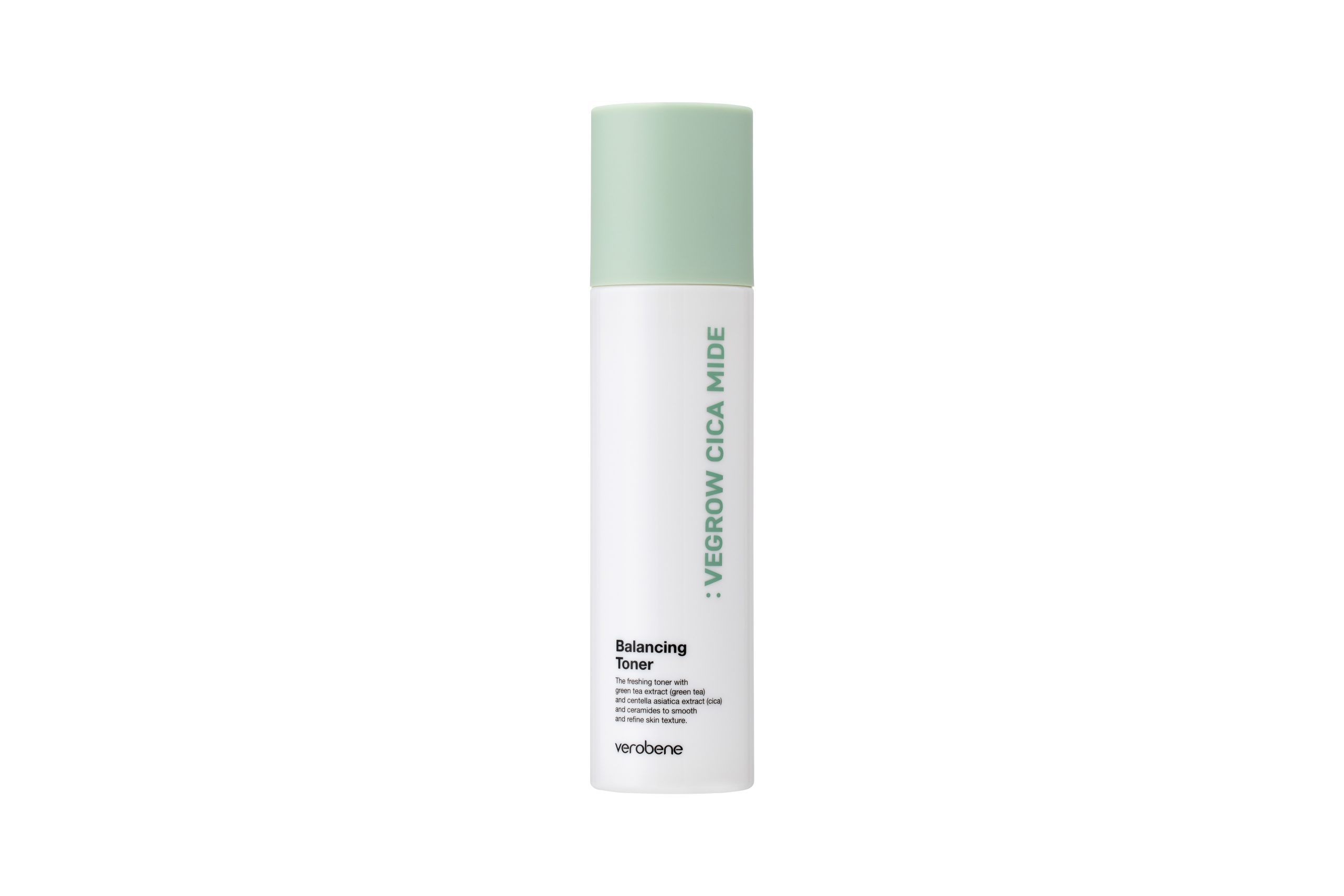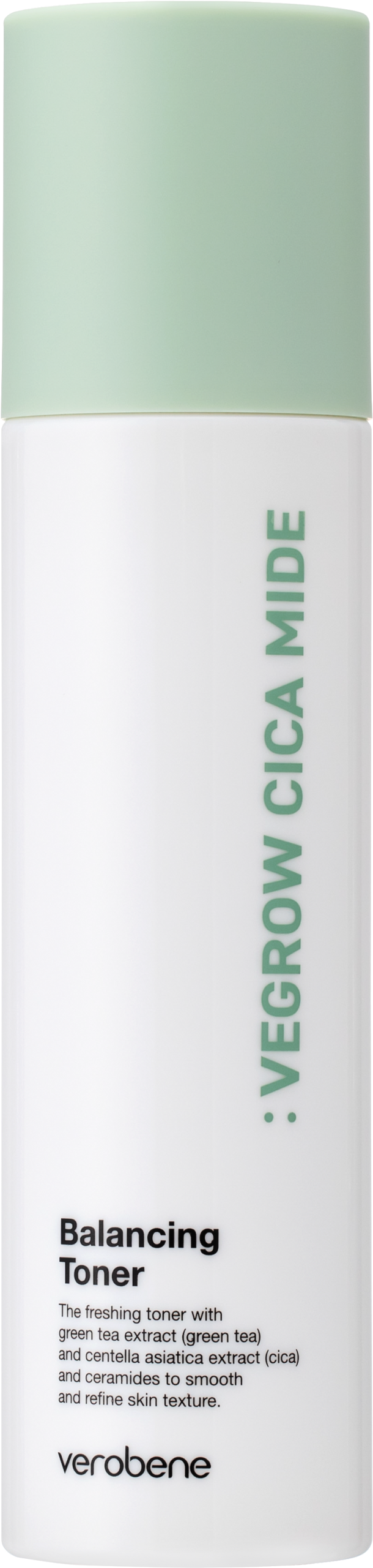 Verobene Vegrow Cica Mide Balancing Toner — a vegan balancing toner designed to gently resurface and refresh the skin while maintaining a healthy barrier. AHA/PHA/LHA acids delicately exfoliate, Centella Asiatica and Green Tea calm and revitalize, while Ceramide NP reinforces the barrier and locks in hydration. The water-light, non-sticky texture absorbs quickly, leaving skin balanced, fresh, and comfortable. Perfect for normal, combination, oily, and sensitive skin